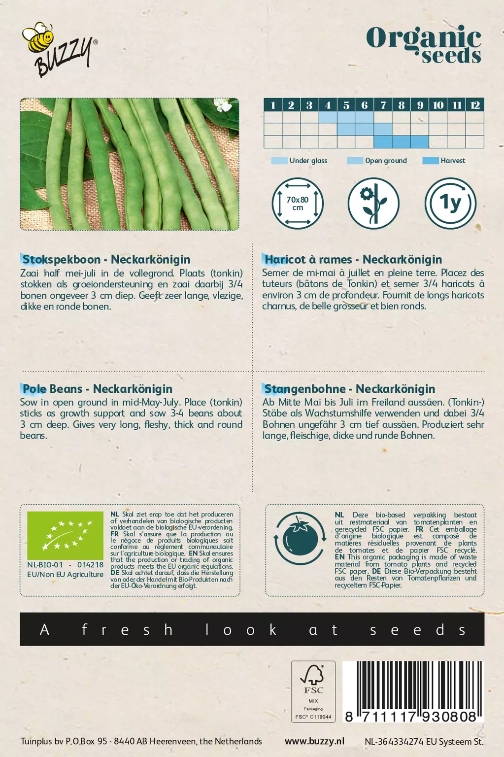 Stokspekboon - Neckarkönigin_x000D_ Zaai half mei-juli in de vollegrond. Plaats (tonkin) stokken als groeiondersteuning en zaai daarbij 3/4 bonen ongeveer 3 cm diep. Geeft zeer lange, vlezige, dikke en ronde bonen.