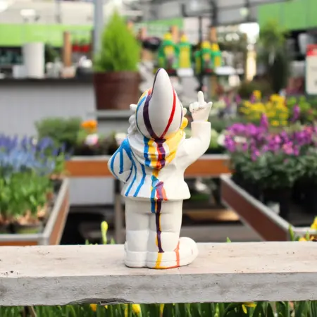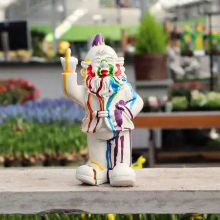 Deze kabouter valt niet alleen op door zijn brutale gebaar, maar ook door zijn unieke en bonte kleurencombinatie. In plaats van een traditionele effen kleur, is hij voorzien van een levendig en speels patroon dat hem tot een echte blikvanger maakt. Of je hem nu tussen de planten zet, op je terras plaatst of op je balkon neerzet, zijn kleurrijke uitstraling maakt hem een echte eyecatcher.