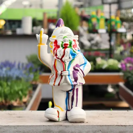 Wat deze kabouter extra bijzonder maakt, is zijn bonte, meerkleurige uiterlijk. In plaats van een effen kleur heeft hij een levendig, speels patroon dat hem nog meer in het oog laat springen. De combinatie van felle tinten en een gedurfd gebaar maakt hem een echte blikvanger in iedere tuin. Zet hem tussen het groen en laat hem bezoekers verrassen met zijn unieke uitstraling.