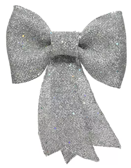 Deze zilveren kerststrik is bedekt met glitters waardoor het een glanzende kerst wordt. Deze strik kan gebruikt worden als decoratie in de kerstboom of om cadeaus mee te versieren.