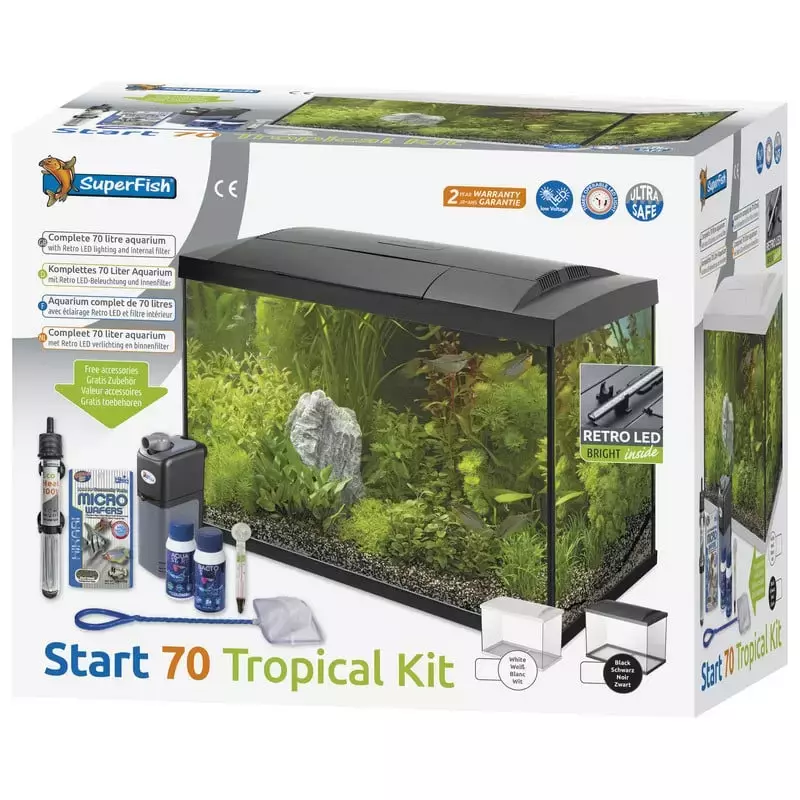 Wil jij beginnen met het opzetten van een tropisch aquarium? Dan is de "Superfish Start 70 tropical kit" echt wat voor jou! Met dit starterpakket van Superfish word jij een handje geholpen. Het aquarium wordt compleet geleverd met alle accessoires die jij nodig hebt, zoals onder andere; ledverlichting, een binnenfilter (Aqua-Flow 200), een Eco Heater, en voer. Door de stroming vanuit de binnenfilter, de warmte van de Eco Heater en het zonlicht dat nagebootst wordt door de ledverlichting is het Superfish aquarium ideaal voor tropische vissen.