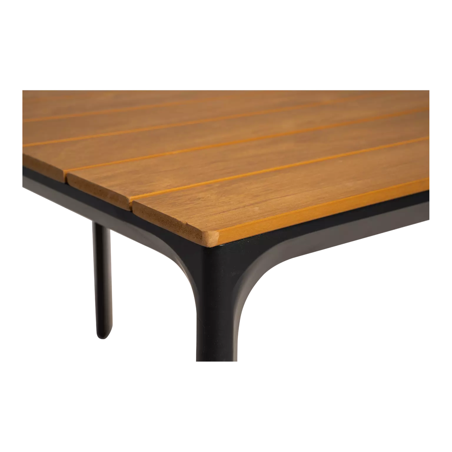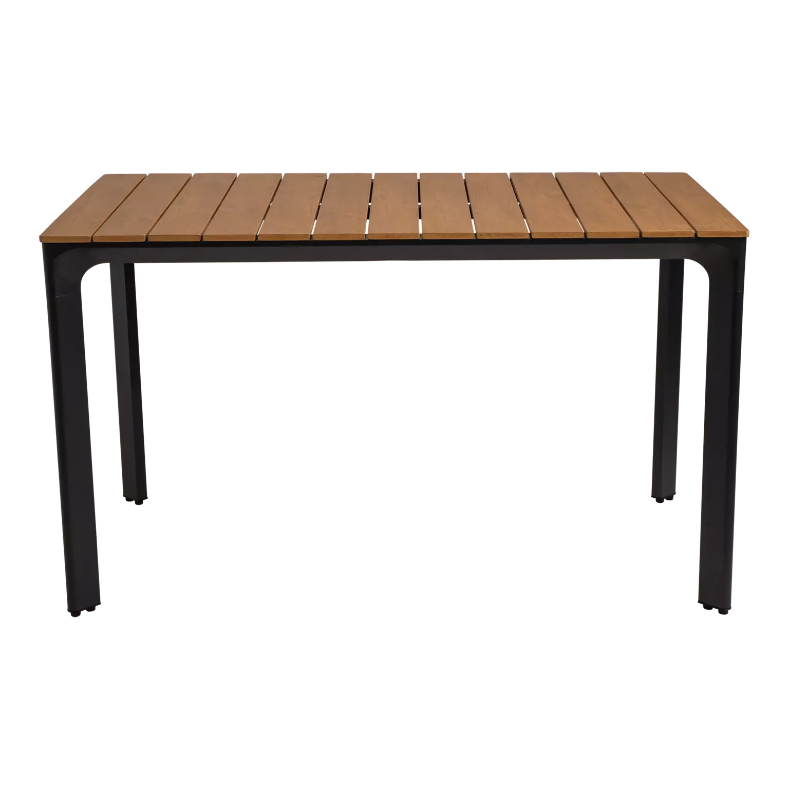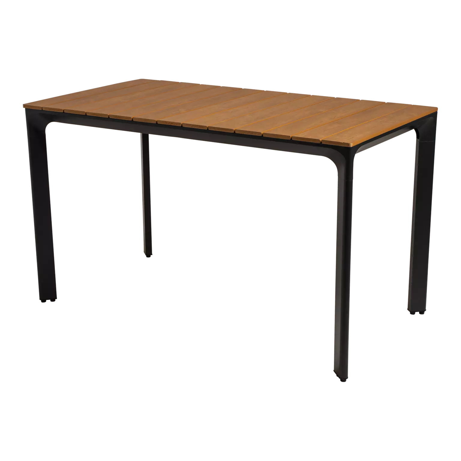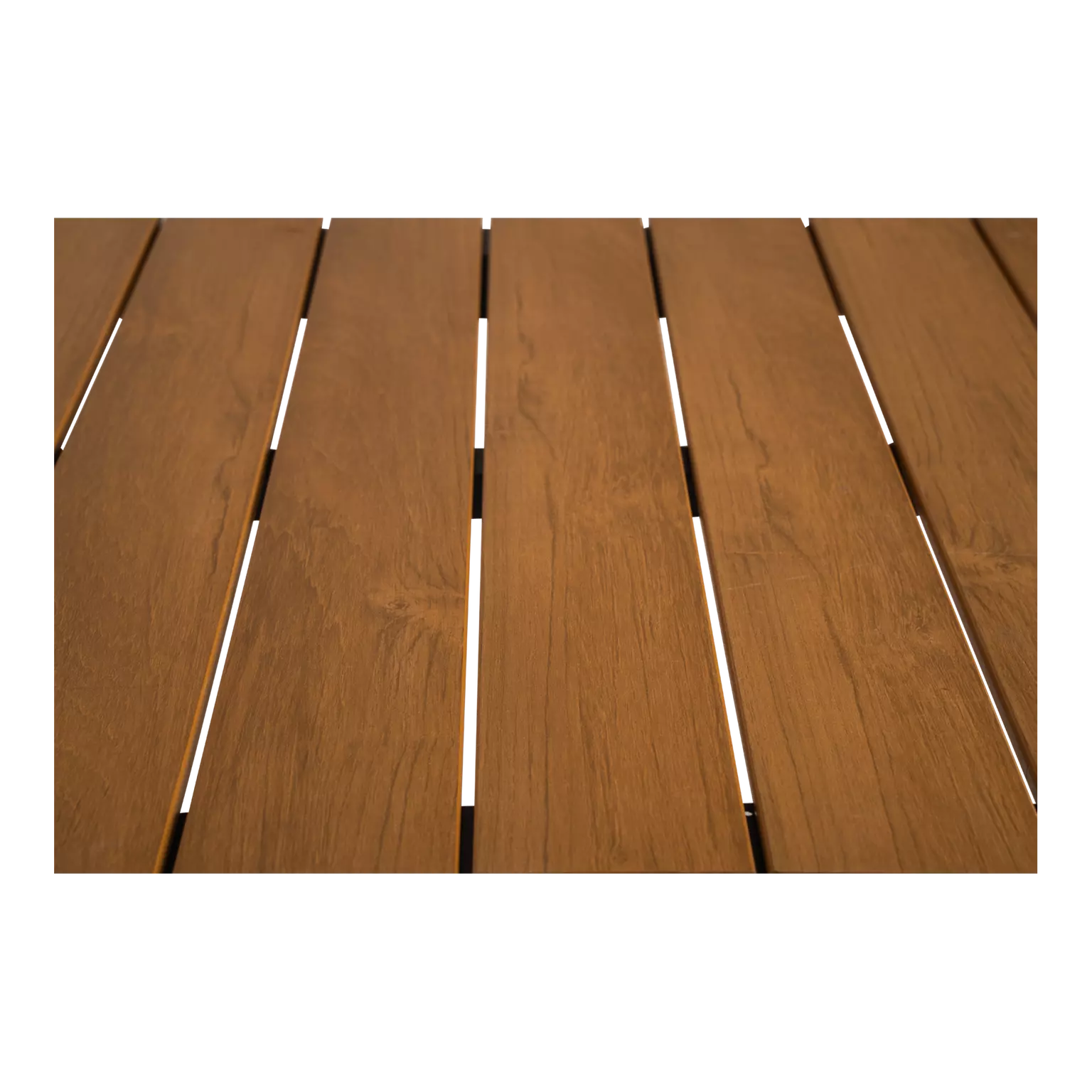 - Het polywood tafelblad met teaklook biedt de warme uitstraling van echt hout zonder het intensieve onderhoud.