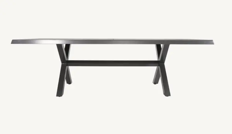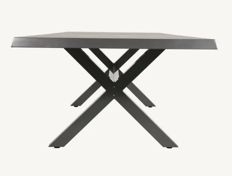 Het tafelframe is gemaakt van aluminium, een materiaal dat bekend staat om zijn weerbestendigheid en duurzaamheid. Aluminium is bestand tegen roest en corrosie, waardoor de tafel geschikt is voor langdurig gebruik in diverse weersomstandigheden. De zwarte afwerking van het aluminium frame draagt bij aan een moderne en industriële uitstraling, perfect voor eigentijdse buitenruimtes.