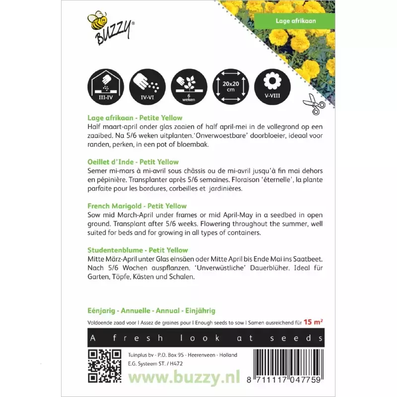 Lage afrikaan - Petite Yellow_x000D_ Half maart-april onder glas zaaien of half april-mei in de vollegrond op een_x000D_ zaaibed. Na 5/6 weken uitplanten. ‘Onverwoestbare’ doorbloeier, ideaal voor_x000D_ randen, perken, in een pot of bloembak.