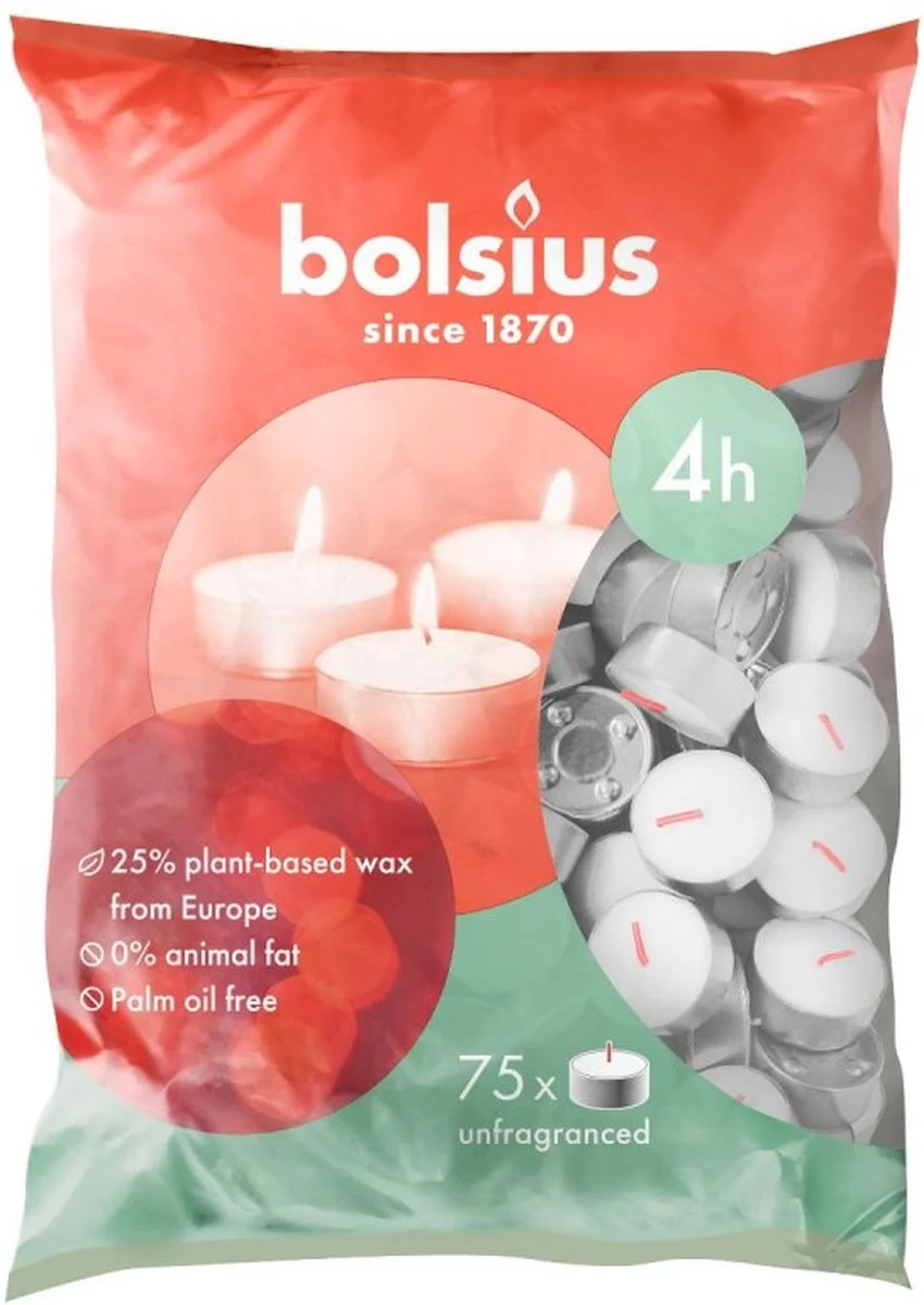 Een zak met 75 theelichten van Bolsius. Elke lichtje gaat circa 4 uur mee, is geurloos, is duurzaam gemaakt en heeft een doorsnede van 4 centimeter.