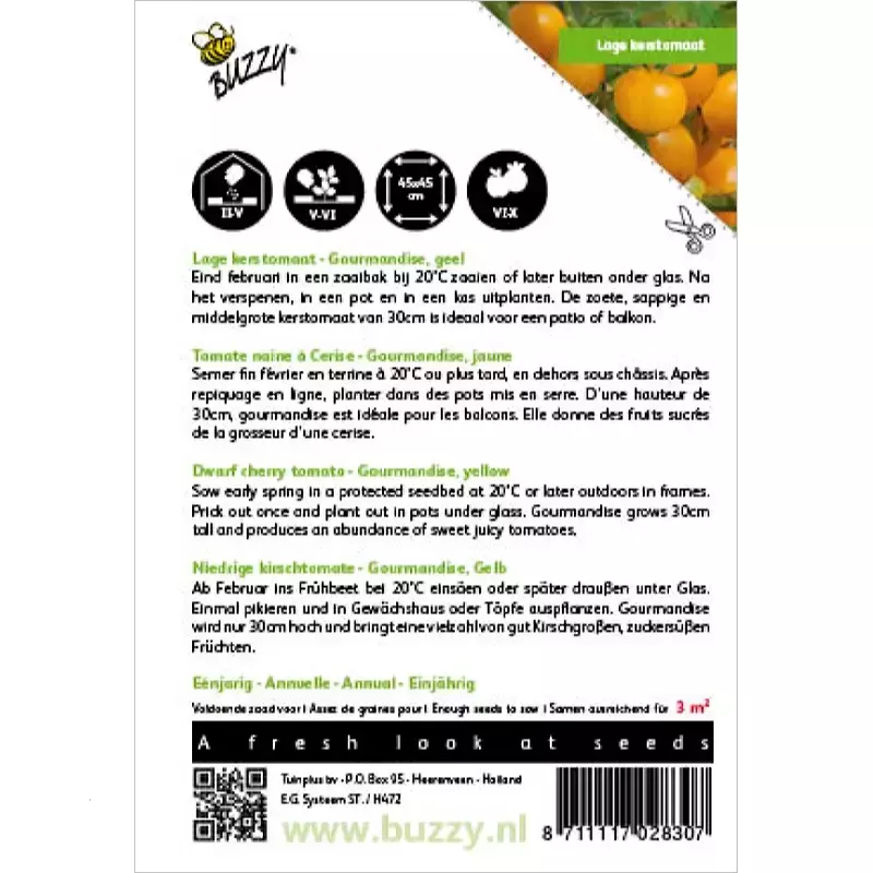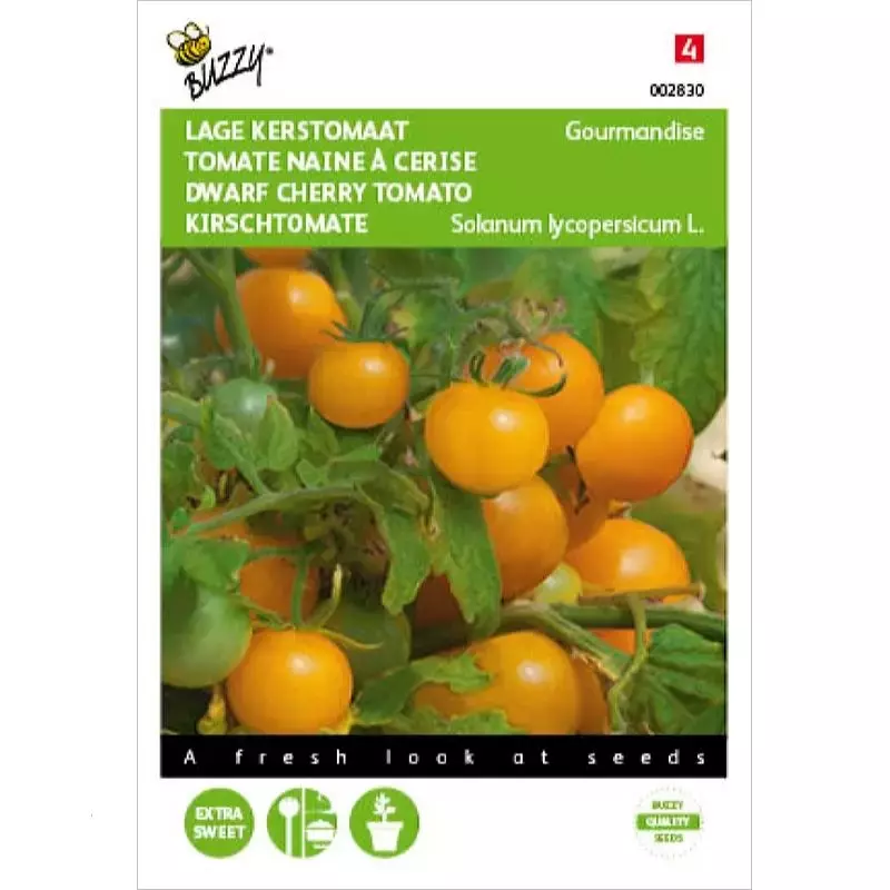 Lage kerstomaat - Gourmandise Yellow_x005F_x000D_ Vanaf eind februari in ‘n zaaibakje bij 20°c of later buiten onder glas. Na_x005F_x000D_ verspenen, in een kasje of in potten uitplanten. Gourmandise wordt maar 30_x005F_x000D_ cm hoog en is ideaal voor patio en balkon. Zoete, middelgrote kerstomaat._x005F_x000D_