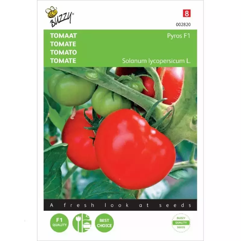Tomaat - Pyros F1_x005F_x000D_ Eind februari in een zaaibak zaaien bij 20°C of later buiten onder glas. Na het_x005F_x000D_ verspenen, direct in een kas of in potten uitplanten. Pyros is een middelvroeg_x005F_x000D_ ras met goede ziekteresistentie en geeft ronde vruchten van ongeveer 200_x005F_x000D_ gram. Geschikt voor buitenteelt, regelmatig dieven.