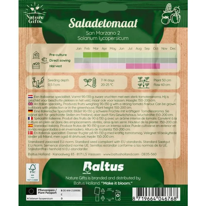 De tomaat 'san marzano 2' is een Italiaanse specialiteit. Dit ras staat bekend om zijn langwerpige vruchten met stevig vruchtvlees en weinig zaden. Geschikt voor beschutte plekken.
