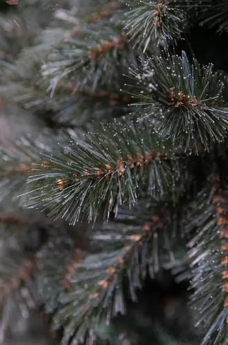 Het meest opvallende kenmerk van de Forest Frosted kunstkerstboom zijn de naalden. Ze zijn niet zomaar groen, maar hebben een witte kern die zorgt voor een schitterend frosted effect aan het uiteinde van elk naaldje. Dit geeft de boom een natuurlijke uitstraling alsof hij rechtstreeks uit een bevroren woud komt. De takken hebben een warme, natuurlijke bruine kleur, en de stevige PVC naaldjes zijn subtiel bedekt met een betoverende blauwe waas. Hierdoor krijgt de boom een elegante grijze-blauwe tint, die doet denken aan de prachtige blauwsparren in de natuur.