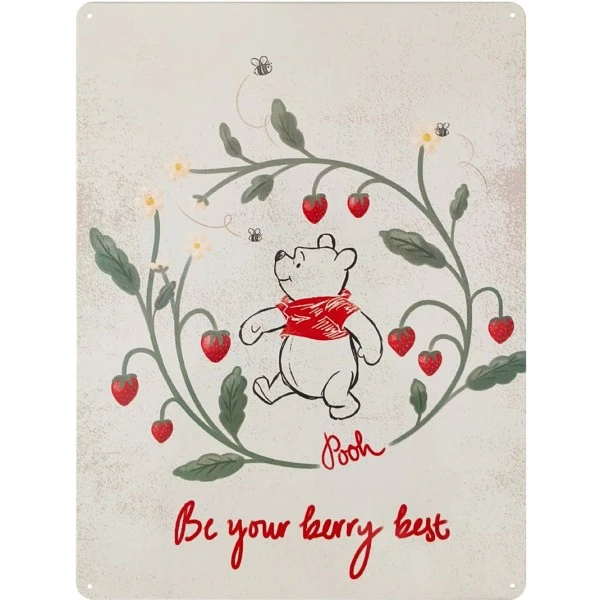 Dit charmante metalen tuinbord uit de Disney Home collectie toont een vrolijke Winnie de Poeh met aardbeien. De inspirerende tekst "Be Your Berry Best" maakt dit bord niet alleen decoratief, maar ook een dagelijkse bron van positiviteit. Of je nu een kale schutting wilt opvrolijken of een gezellig hoekje in je tuinhuis wilt creëren, dit bord past overal.