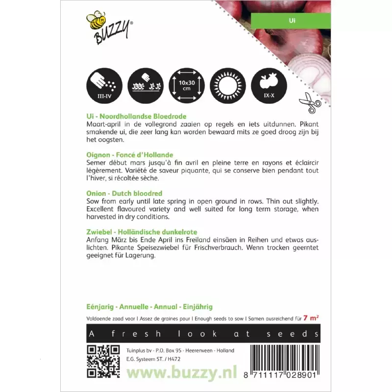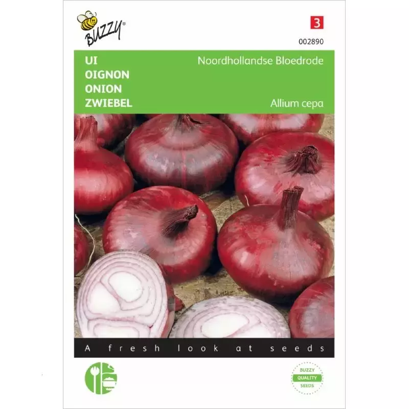 Ui - Noordhollandse Bloedrode_x005F_x000D_ Maart-april in de vollegrond zaaien op regels en iets uitdunnen. Pikant_x005F_x000D_ smakende ui, die zeer lang kan worden bewaard mits ze goed droog zijn bij_x005F_x000D_ het oogsten.