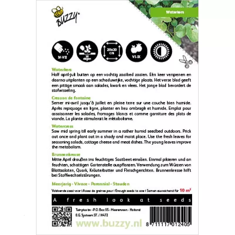 Waterkers_x005F_x000D_ Half april tot juli buiten op een vochtig zaai-bed; één keer verspenen en_x005F_x000D_ daarna uitplanten op een schaduwrijke, vochtige plaats. Gebruik: vers blad_x005F_x000D_ geeft een pittige smaak aan salades en kwark alsmede bij vlees. Jong blad_x005F_x000D_ schijnt de stofwisseling te bevorderen._x005F_x000D_ _x005F_x000D_