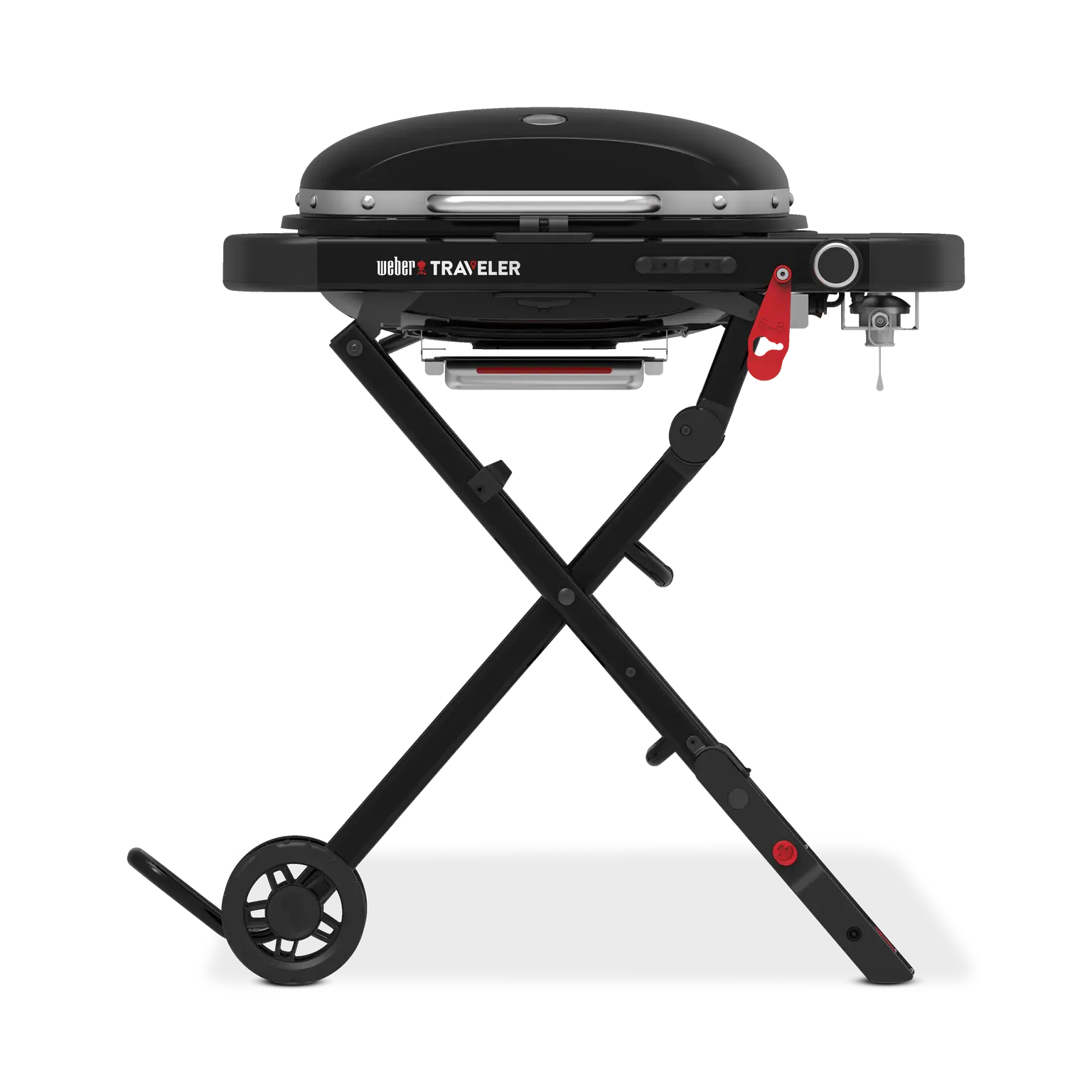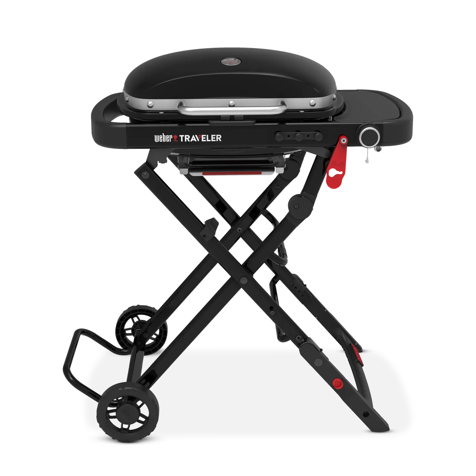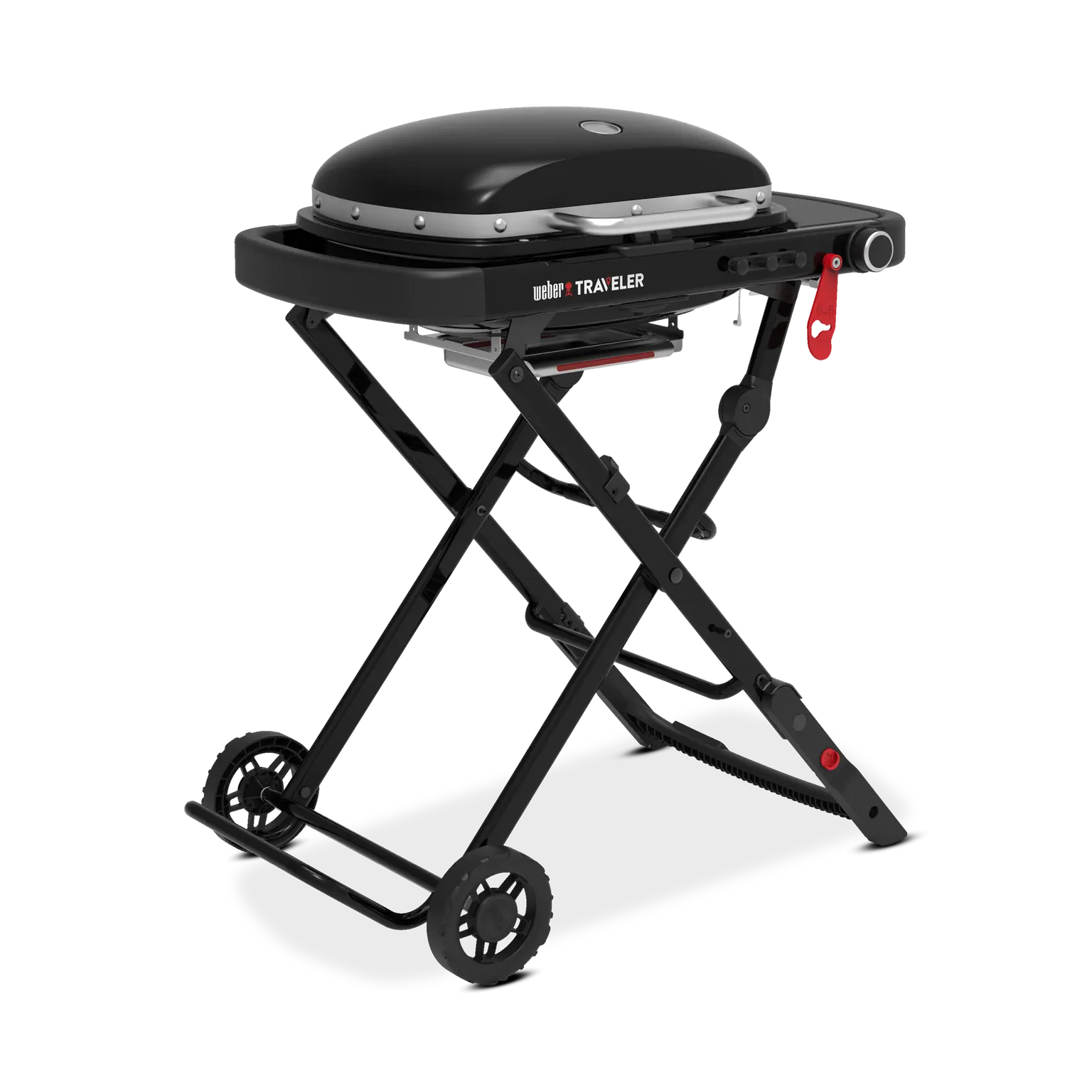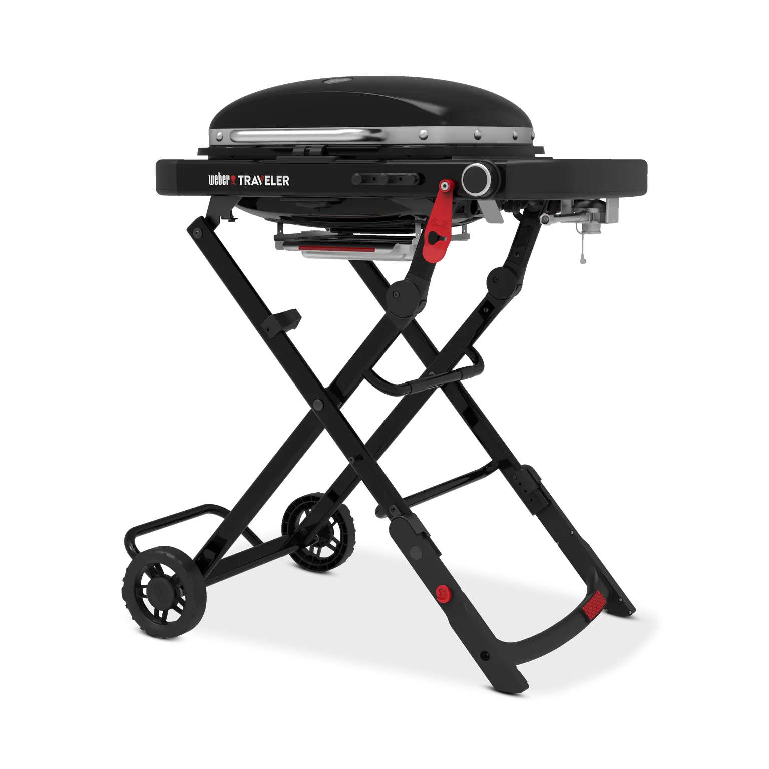 Weber Traveler compact: Een handige en ruime gasbarbecue, ideaal voor onderweg genieten van heerlijk gegrild eten, met een eenvoudig opvouwbaar ontwerp voor gemakkelijk vervoer in de auto en een stoere matzwarte finish.