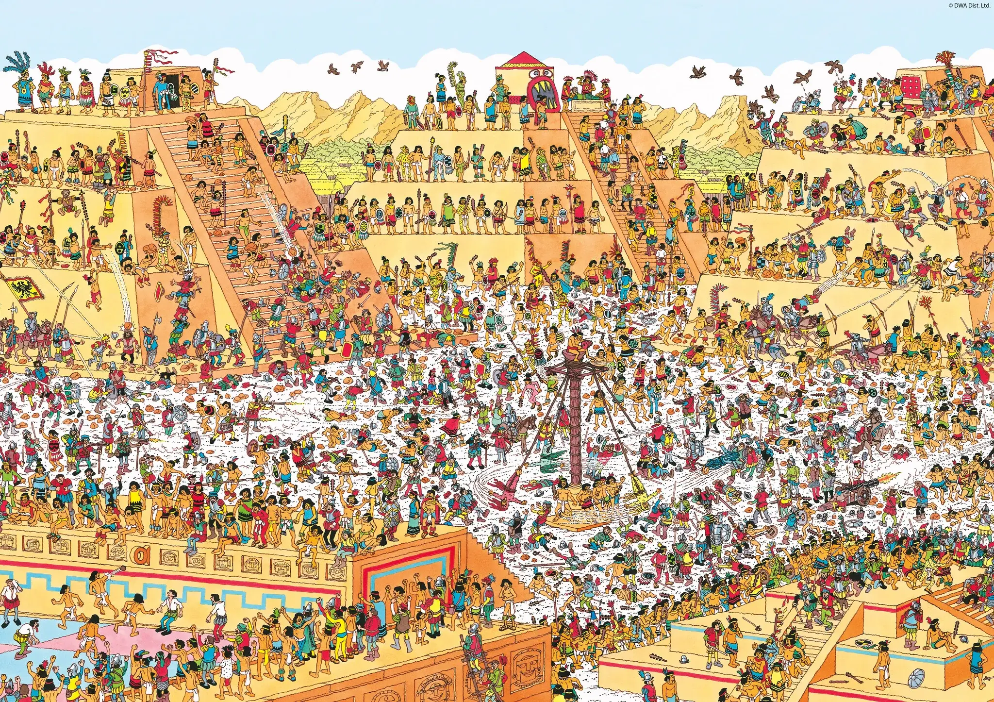 Deze puzzel is perfect voor fans van Where’s Wally en iedereen die van een zoek- en puzzeluitdaging houdt. Duik in de Azteekse wereld en probeer Wally te vinden tussen piramides, tempels en een levendige chaos. Vergeet ook niet om Wenda en Wilma te zoeken!