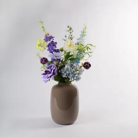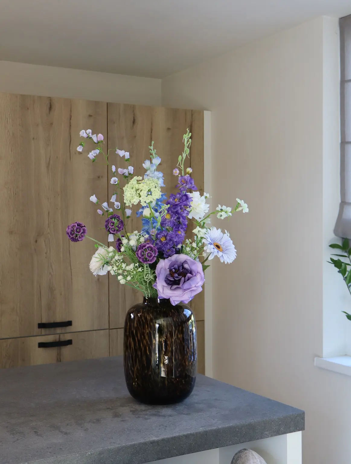 Purple Pop is perfect voor wie houdt van kleur, zonder dat het té schreeuwerig wordt. Dankzij de hoogwaardige zijden bloemen geniet je seizoen na seizoen van dit boeket, zonder zorgen over water of verwelking.