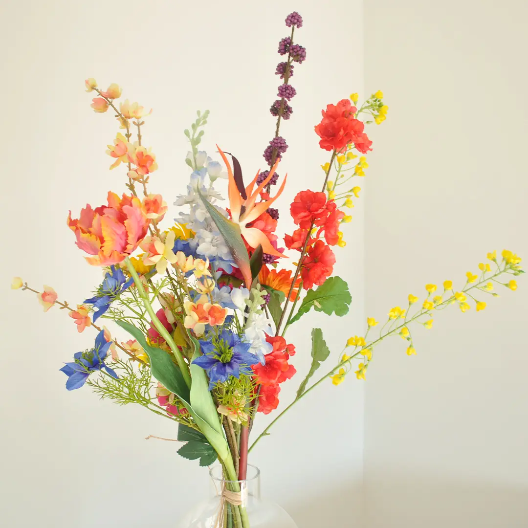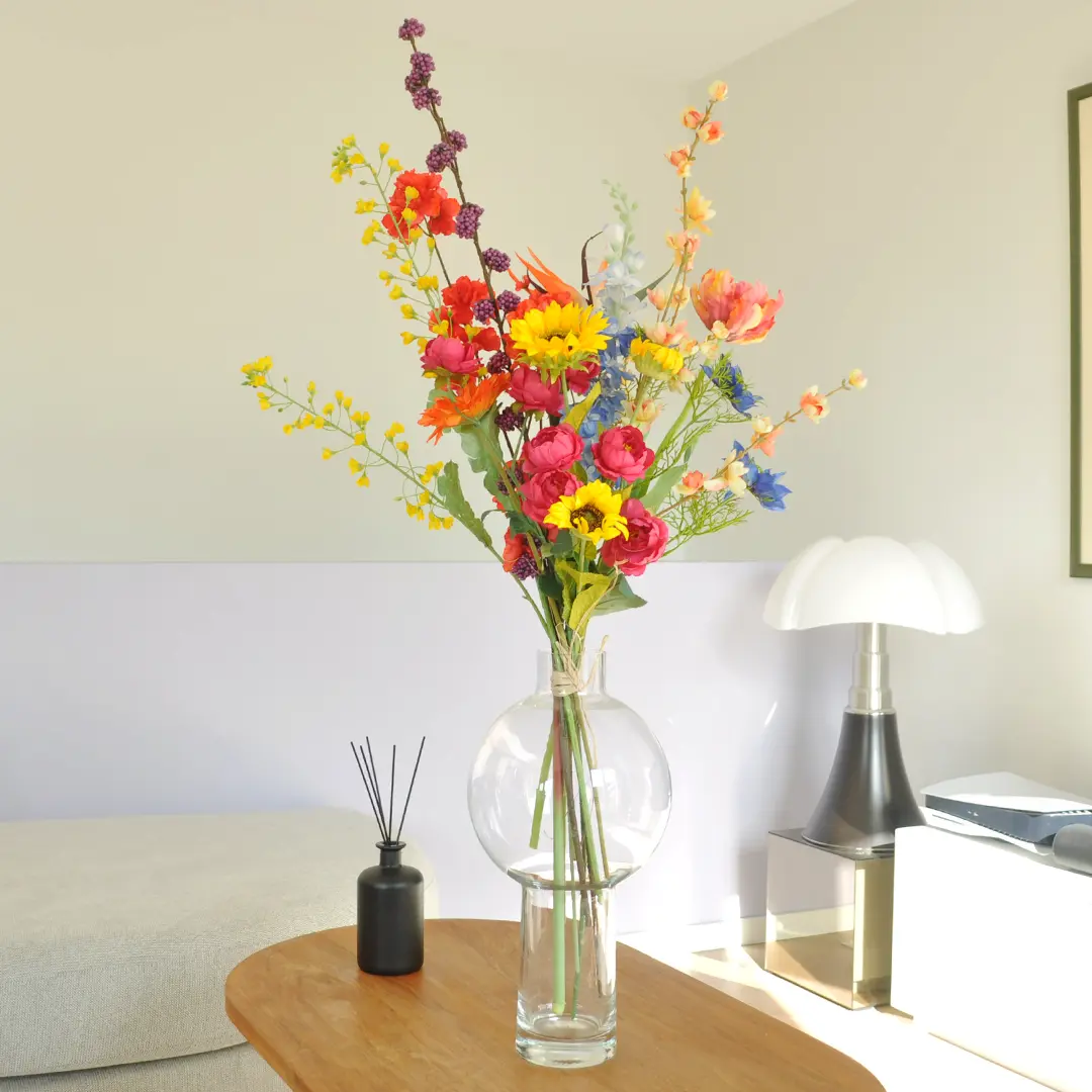 Deze kunstbloemen hebben niet alleen een levendige uitstraling, maar ook het voordeel van onderhoudsgemak. Geen zorgen over water geven of verwelking; dit boeket behoudt zijn levendigheid en kleur zonder enige moeite van jouw kant.