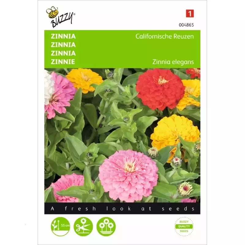 Zinnia - Californische Reuzen, gemengd_x000D_ Eind april-juli direct in de vollegrond zaaien, Zinnia’s worden niet graag_x000D_ verplant. Uitstekende snijbloemen en ook zeer mooi in de hoge border. Bloeit_x000D_ langdurig op een zonnige en warme plaats.