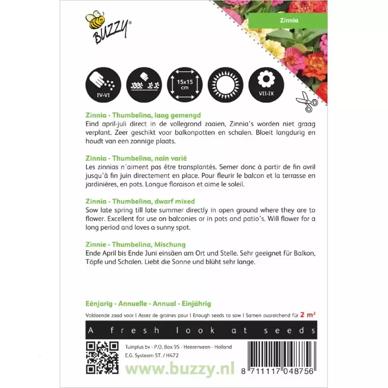 Zinnia - Thumbelina, laag gemengd_x000D_ Eind april-juli direct in de vollegrond zaaien, Zinnia’s worden niet graag_x000D_ verplant. Zeer geschikt voor balkonpotten en schalen. Bloeit langdurig en_x000D_ houdt van een zonnige plaats.